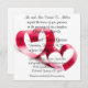 Convites de casamento de corações vermelhos. Este convite para casais planejando um casamento combina a formulação tradicional para um com uma forma cardíaca moderna simulando o aparecimento de fitas. As informações de RSVP podem ser adicionadas ao convite ou usar placas de resposta de convidado separadas como gabinetes.