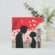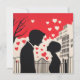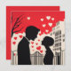 Uma trabalho de arte visualmente impressionante que mostra uma cena romântica com um casal silenciado olhando um para o outro. O fundo mostra um céu vermelho vibrante cheio de corações brancos e vermelhos flutuantes, ao lado de prédios pretos e brancos estrelados e uma árvore nua, sugerindo um cenário urbano. O estilo artístico é ousado, moderno e minimalista, enfatizando o amor e a conexão entre as duas figuras.