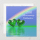 Convite de aniversário esmeralda de 55 anos com um arco-íris em um céu azul e dois corações esmeralda brilhantes flutuando na água. Personalize o texto de exemplo no verso com suas próprias informações para o seu evento.