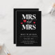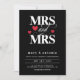 Convite romântico para casamento de tipografia em preto para um casamento lésbico com a MRS e a MRS, escrito em letras brancas e negrito com corações roxos e vermelhos. Adicione detalhes sobre o seu casamento às costas.