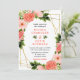 This fun and whimsical wedding invitation features watercolor coral pink red roses and foliage on a gold geometric frame. The text combines handwritten script and serif fonts for a stylish and modern look. This is perfect for a spring or summer rustic wedding.