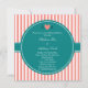 Listras cor-de-coral, cor-de-rosa, brancas, com convites para janto de ensaio. O design apresenta um padrão de listras cor-de-rosa e brancas alternadas no plano de fundo. Também a design apresenta as iniciais da noiva e do noivo separadas por um coração cor-de-rosa. Um padrão listrado elegante e no meio há um círculo teal onde adicionar o texto do seu convite.