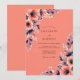 This vibrant design features a bold coral backdrop accented by lush floral arrangements. Elegant navy blue foliage contrasts beautifully with soft peach anemones and delicate watercolor sprigs. The overall mood is sophisticated and romantic, making it ideal for a bright seasonal event.
