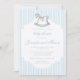 Explore nosso encantador convite para chá de bebê inspirado no vintage, cheio de elementos de pré-disquete encantadores. Com um querido cavalo de balanço azul de madeira contra um pano de fundo listrado, este convite expele elegância e alegria, evocando influências estéticas francesas. Ideal para acolher seu pequeno, este convite dá o tom perfeito para sua celebração.