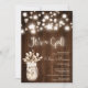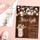 Um outono legal e rústico. É um chá de fraldas feminino. Com as lanternas de fadas leves de cordas, e estrelas, um jarro de pedras brilhantes com flores silvestres em madeira marrom rústica, com uma caligrafia de bolos brilhando com a mão.