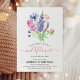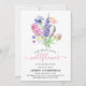 Um convite de festas de primeiro aniversario de flor silvestre, branco, que apresenta um buquê de flores silvestres e verde de cor aquosa. Um doce convite para a primeira comemoração de aniversário de uma menina.