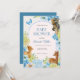 Aquarelas azuis, animais fofos e flores, convite ao chá de fraldas. Cinzas escuras e tipografia azul personalizáveis em um fundo de rosa claro.