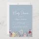 Uma bela borda floral de aquarela de flores silvestres em um fundo azul empoeirado decora a borda inferior deste convite para chás de fraldas. As palavras "Chá de fraldas" aparecem num elegante guião branco de escrita manual. Personalize o resto do texto com o nome da futura mãe, data, local e detalhes de RSVP. Ideal para primavera, verão ou chá de fraldas de outono.