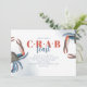 Esta design apresenta um simples banquete de caranguejo azul-aquarela, com um assar de caranguejo náutico, um mar oceânico costeiro vivo, excelente para o evento de janto de marisco, um texto de tipografia de tendência na moda, uma tipografia moderna de escrita de caligrafia, com estilo costa Maine na Nova Inglaterra de Maryland, coxas de caranguejo cozido, um elegante oceano divertido na moda com um animal marinho azul-crustáceo