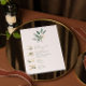 Cores d'água elegantes, verde e folhas de ouro para o menu de casamento em um fundo branco nítido. Menu em letras douradas decoradas com folhas verdes e douradas. Design simples e minimalista.