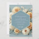 Experience a romantic union with this artistic design. A lush arrangement of creamy white and golden ochre chrysanthemums blooms against a serene cornflower blue background. The soft, painterly details create a timeless and elegant atmosphere for your special day.