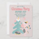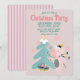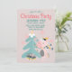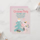 Este convite de festas de Natal personalizado apresenta uma ilustração de desenho animado bonitinha, no estilo "boho". Um unicórnio rosa bonito está decorando sua árvore de Natal debaixo dos flocos de neve que caem. O plano de fundo é uma cor rosa pincelada e suave.