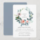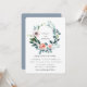 Bela coroa de folhagem de jardim e flores delicadas em aquarela, convite de casamento. O verso do cartão apresenta uma cor azul poeirento sólido.