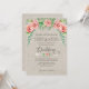 Estilo boêmio chique para um casamento rústico, elegante e relaxado! Esta coroa de flores de rosas cor-de-rosa coral, baby's breath e folhagem está num estilo solto e divertido com títulos de tipografia caligráfica em estilo manuscrito (SIM, podemos personalizá-los para você, basta nos enviar uma mensagem e permitir alguns dias para criá-los para você). O fundo é em madeira desgastada cinza suave com redemoinhos sutis e um divisor tipográfico de dupla seta separa os detalhes. No verso estão suas iniciais e o desenho da flor da seta. Direitos autorais de Audrey Jeanne Roberts, todos os direitos reservados.