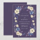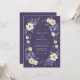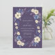 Este design encantador apresenta um fundo roxo profundo adornado com uma coroa de flores em tons de creme, azul e lavanda. Flores delicadas e folhagens exuberantes criam uma atmosfera elegante e romântica para o seu dia especial.