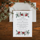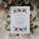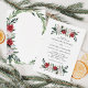 Este convite de casamento de Natal simples e elegante apresenta buquês estilizados em aquarela feitos de folhagens modernas e flores de Natal vermelhas e brancas sobre um fundo branco. O verso do convite apresenta uma coroa de Natal elegante e correspondente.