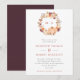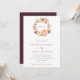 Um convite de casamento de outono bonito com uma coroa floral de aquarela com laranja terracota, roxo berinjela e flores de pêssego, decorado com uma abóbora. Personalize com seu monograma na coroa e os detalhes do seu casamento em terracota e cinza. O verso é em roxo berinjela sólido.