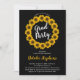 Convites de festa de graduação boho amarelo dourado e preto com coroa de girassóis ensolarados. Design original de Holiday Hearts Designs (todos os direitos reservados).