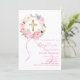 Um fundo branco elegante, decorado com flores cor-de-rosa e brancas pintadas com aquarela em uma coroa, um laço rosa e uma cruz dourada. Personalize e adicione um nome e detalhes.