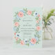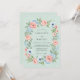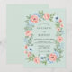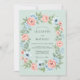Um sereno fundo verde menta apresenta uma delicada coroa de rosas em flor, anêmonas e pequenas flores azuis. Este design romântico evoca um clima suave e caprichoso, perfeito para uma ocasião de primavera ou verão. A paleta de cores suaves cria um ambiente arejado e elegante.