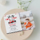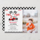 Dois carros rápidos correm em convites de aniversário de crianças adoráveis com uma corrida de carro vermelho. Um tema de carro de corrida para um segundo aniversário com ilustração de um carro vintage vermelho com as palavras "Crescendo muito rápido."