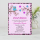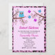 Convite de aniversário muito bonito com coruja num galho em uma armação rosa-leopardo. Personalize o texto, as fontes e as cores, como preferir.