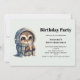 Um convite de aniversário com uma bela ilustração de uma coruja fofa num roupão de inverno e cachecol segurando um café quente.