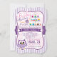É uma garota! Chá de fraldas de convite para o tema das corujas brancas, coloridas e roxas, no padrão das listras retro-púrpura e púrpura. Cupcakes, cor-de-rosa, coral, amarelo, azul, verde, roxo, castanho, branco e laranja, flores roxa e amarela, e coruja roxa lavanda. Excelente para coruja giro, chás de fraldas temáticos primavera! Vintage, convite em forma de colchete elegante.