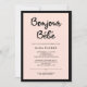 Estes elegantes e parisienses convites para o chá de bebê dizem "bonjour bébé" em tipografia negra. Um fundo cor-de-rosa suave e claro está rodeado por uma moderna fronteira preta.