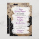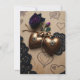 Um bonito convite para casamento com couro, rendas pretas, rosas roxas e um elemento de coração de galo. Um tema único bonito para não o casal médio.