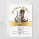 Uma bota de solteiro de couro marrom de couro tem gravuras florais brancas e flores margaridas brancas ao redor. A bota tem uma bela garrafa de ouro falso e prateada de espuma ao seu lado e uma flauta de champanhe colocada sobre uma banda horizontal falsa de ouro revestida com um ouro colocado sobre um fundo branco. Modelos editáveis de ouro, preto e branco podem ser personalizadas para se adequarem à sua celebração especial. Este convite para descarregamento de na moda é ideal para um evento especial de temas ocidentais, "botas e borras" no país ou "botas e borbulhas" também.