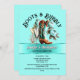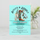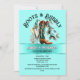 Um par de couros de botas de cowboy castanhas e azuis, com uma incrustação padrão, tem flores aqua azuis, ao lado dela, e um copo d'água, de borbulhamento, e um cocktail martini, colocado sobre um fundo azul-real. Modelos de texto preto editáveis podem ser personalizadas para se adequarem à sua celebração especial. Este convite para descarregamento de na moda é ideal para um evento especial de temas ocidentais, "botas e borras" no país ou "botas e borbulhas" também.