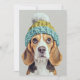 Este lindo beagle está pronto para o inverno com seu lindo chapéu de malha, com tons de verde e azul, revestido com um pom-pom fofo. Os olhos expressivos do cão e as orelhas de disquete o fazem parecer ainda mais carinhoso e pronto para a estação fria.
