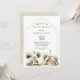 This elegant two-sided card features soft watercolor illustrations of glamping tents surrounded by muted greenery, creating a cozy boho atmosphere. The front highlights the event details within a clean, sage green geometric frame using a mix of modern serif and script fonts. The back includes a matching design and a neatly organized timeline with times and activities, all set against a warm, neutral background for a refined, nature-inspired look.