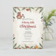 Warm and inviting Christmas party invitation with charming woodland creatures – a friendly bear and a cute penguin wearing festive scarves – nestled among pine branches, holly, and decorative red ornaments. The soft beige background and scattered natural elements create a cozy, cabin-style aesthetic perfect for intimate holiday gatherings and rustic celebrations.