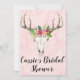 O convite moderno apresenta a ilustração aquosa de um crânio no estilo Boho com flores e folhagem insulares sobre fundo de bolinhas branco e cor-de-rosa com manchas aquáticas