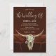 Este convite de casamento de cartão plano com crânio de touro rodeo marrom rústico apresenta um design inspirado em casa de fazenda country ocidental. Animal de fazenda estilo antigo ocidental selvagem legal, moderno e vintage. Personalize sua tipografia. Direitos autorais da imagem Marg Seregelyi Photography.