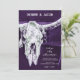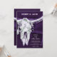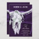 Esses modelos de cartão de convite de casamento planos rústicos ocidentais exclusivos de 5x7 você pode personalizar apresenta um design de fundo de textura country roxa escura e branca com caveira de touro de cowgirl de rodeio. Estilo vintage de celeiro antigo inspirado no velho oeste selvagem, design de animal de fazenda moderno e legal. Rsvp online no verso. Direitos autorais da imagem Marg Seregelyi Photography.