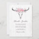 Envie a sua família e amigos, este trendy Boho inspirou um convite de casamento personalizado e rústico. Este modelo apresenta um crânio de vaca desenhado à mão com um vestido de cabeça floral cor-de-rosa pincelado de rosas delicados sobre um fundo de madeira branca e cinza com penas. Personalize seus detalhes de casamento em um roteiro elegante. A parte de trás da placa também tem uma textura de madeira falsa para combinar. Os melhores votos para o seu casamento. Desenhada pela artista Susan Coffey.