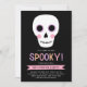 Este convite de aniversário super fofo apresenta um crânio desenhado à mão, com sotaques pastel rosa e roxo. O pêssego do Pastel também é incorporado ao design. O texto diz: "É hora de colocar SPOOKY!" em uma fonte moderna e multicolorida! A parte de trás da carta contém estrelas rosa, roxas e cor de pêssego sobre um fundo preto. *Trabalho de arte por Orabella Impressão