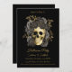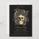 Convite de festa de Halloween adulto com crânio gótico editável. O design apresenta crânio vintage decorado com rosas pretas e douradas brilhantes em um fundo preto! Personalize o texto e altere o estilo e a cor da fonte para combinar. O brilho não é um efeito de brilho "real" mas sim um efeito impresso.