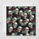 Crânios brancos e rosas vermelhas com folhas verdes em um fundo preto fazem disso um design único e impressionante.