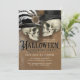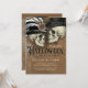 Planeje uma festa de fantasia gótica vitoriana do Halloween com este convite de festas esquisito. Tem crânios masculinos e femininos vestidos de chapéus finos com fundo dourado marmoreado. O emparelhamento de tipo Vintage adiciona estilo autêntico ao design vintage. O texto de exemplo usa um pouco de humor de Halloween convidando seu convidado a "pegar seus ossos aqui". Personalize o modelo de texto com os detalhes do seu partido.