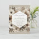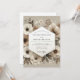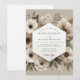 A soft and elegant design features muted cream and taupe blossoms with delicate dark foliage. The airy floral arrangement evokes a serene, romantic atmosphere perfect for a refined celebration. Hints of anemone-like blooms are suggested within the arrangement.