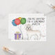 Um design do tema de aniversário bonito com a ilustração original de Destei de um cão da raça Goldendoodle, um casaco de cor de creme bonitinho. Ao lado do cão há balões coloridos de aniversário amarrados num osso de cão e uma caixa de cor roxa e amarela. O fundo tem um padrão lúgubre de confete pastel colorido sobre um fundo branco. Personalize as áreas de texto de exemplo com os detalhes do seu evento.