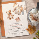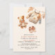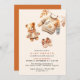Convites de chá de bebê de outono bonitos com ilustrações de cor d'água de um ursinho de pelúcia e roupas de bebê confortáveis. Cor do marfim esbranquiçado com uma laranja queimada brilhante. A design neutra do gênero é perfeita para um bebê ou uma menina.
