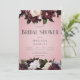 Este simples design de brunch de chá de panela rústico apresenta uma borda superior e inferior de burgundy realista, creme e flores cor-de-rosa com folhagem verde escura sobre um fundo cor-de-rosa empoeirado. O texto é exibido em uma cobertura oval de borrão branco suave. Romântico e elegante. Criado pela imprensa simplesmente de farmácia.