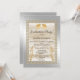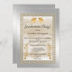 A parte de trás da carta mostra um chapéu grande de ouro, você pode substituí-lo por uma fotografia. Adicione o ano. Sobre o design, esta é uma elegante seda creme com padrão de pérolas com dois chapéus de ouro no topo. O fundo tem uma cor metálica prateada escovada. O convite também apresenta duas joias chic do estilo Inca em cada lado do texto.