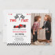 Dois carros velozes, gêmeos, segundo aniversário corrida em convites de festas de aniversários de crianças bonitinhas com uma corrida de carros vermelhos. Um tema de carro de corrida bonito para uma festa de segundo aniversário com ilustração de um carro vintage vermelho com as palavras "Crescendo muito rápido."