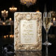 Defina o tom da sua cerimônia formal de primavera com este design luxuoso inspirado no barroco, apresentando elaboradas volutas e uma crista floral romântica.